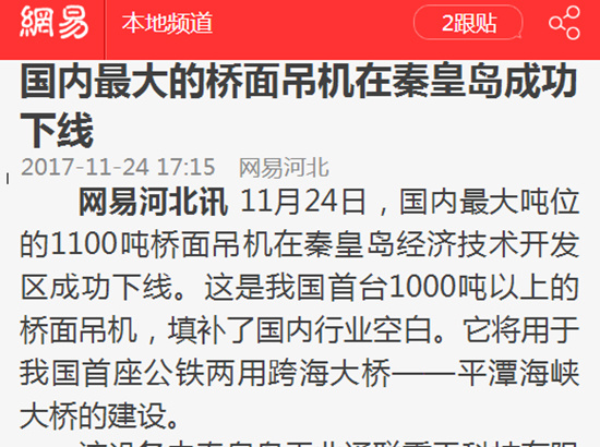 河北新聞聯(lián)播播報通聯(lián)科技1100噸橋面吊機:大塊頭!大智慧!這些國內(nèi)知名“巨無霸”都是河北制造!https://mp.weixin.qq.com/s/m21jvCTzaL4rJUmlSuC3UQ...